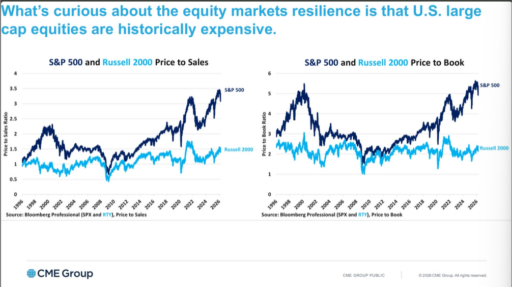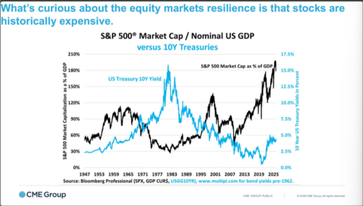 The S&P 500 and other major indices remain near historically elevated valuations, with market capitalization relative to GDP reaching extreme levels.