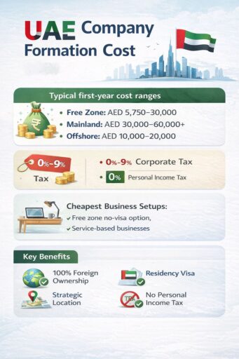 - Free zone with 1 visa: ~AED 12,000 – 30,000