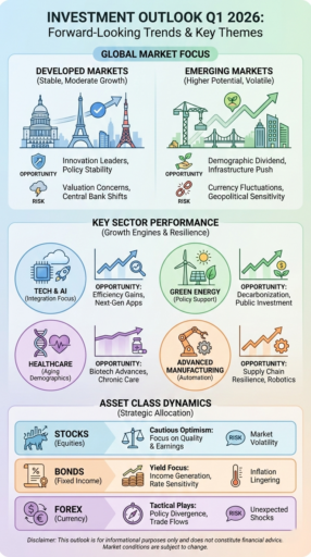 The outlook for developed markets in Q1 2026 is steady but uneven, with growth generally slower than in emerging economies and returns shaped by interest rate levels, inflation dynamics, and sector leadership.
