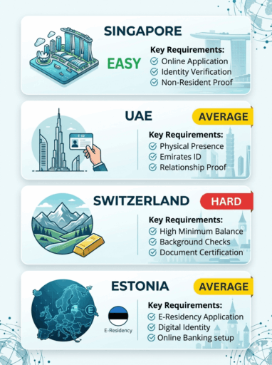 Estonia, Singapore, and Switzerland are widely regarded as among the easiest countries to open a non‑resident bank account due to streamlined processes, clear online application options, and relatively lower barriers to entry compared with many other jurisdictions.
