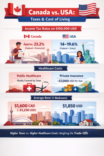 Canada’s higher taxes are offset by publicly funded healthcare and social services, which increase overall living costs.