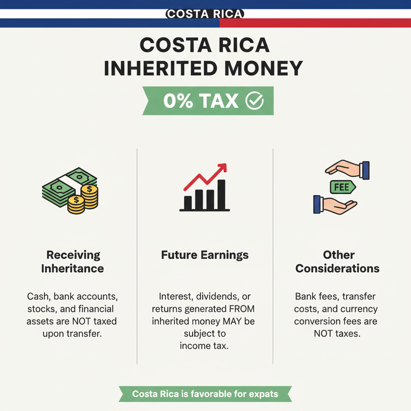 Overall, receiving inherited money itself is tax-free, making Costa Rica favorable for expats and non-residents in terms of cash inheritance.