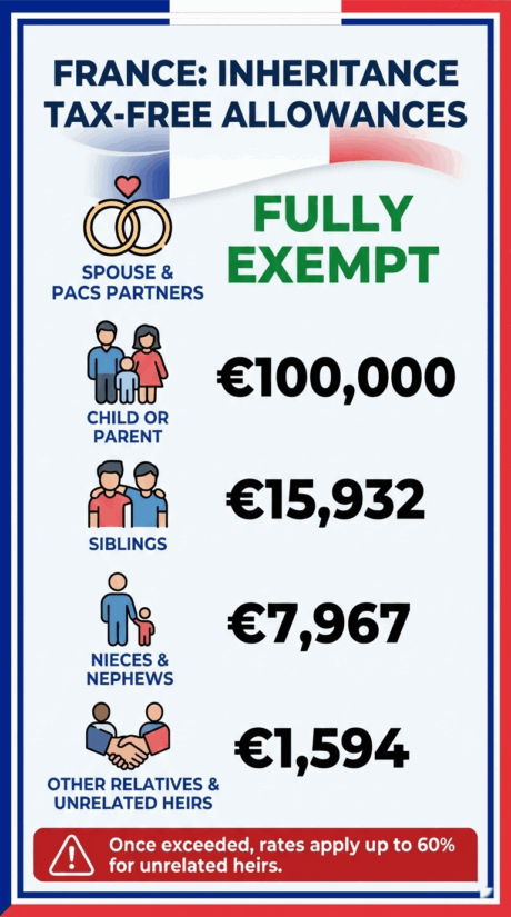 Close relatives benefit from substantial tax-free allowances, while distant relatives and non-family heirs face significantly higher exposure, making early awareness of the rules essential for anyone connected to France.