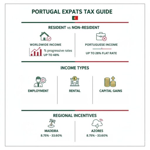 In Portugal, non-residents pay flat tax rates of 25–28%, while residents face progressive rates from 12.50% up to 48%, based on income.