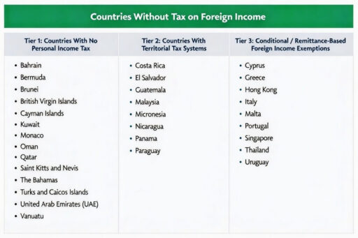 Countries such as the United Arab Emirates and The Bahamas do not impose personal income tax at all, meaning foreign income is not taxed locally regardless of where it is earned.