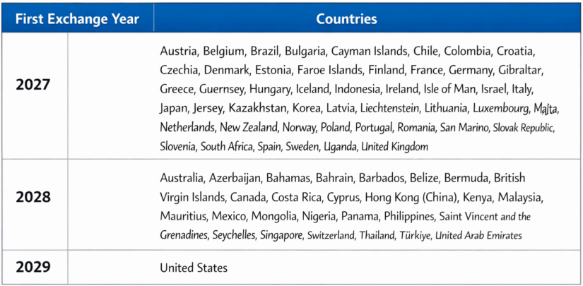The United States is notable as it does not participate in CRS but will implement CARF-style reporting through its own regulatory and tax enforcement framework.