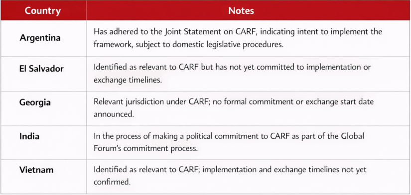 Some of these jurisdictions have expressed intent to adopt CARF in the future, but until domestic legislation and exchange agreements are in place, they remain non-CARF jurisdictions.