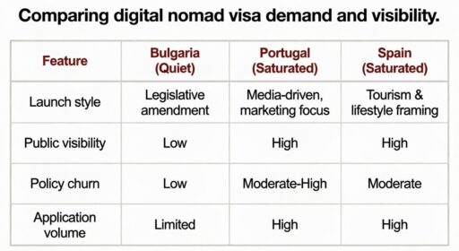 Portugal sells the lifestyle, Spain negotiates the impact, and Bulgaria rewrites the legal framework—making its digital nomad visa less visible, but structurally more durable within the EU.