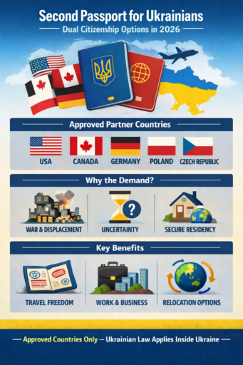 A second passport for Ukrainians is now legally possible with approved countries such as United States, Canada, Germany, Poland, and Czech Republic under Ukraine’s new regulated dual citizenship framework.