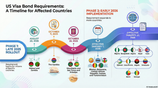 As of January 8, 2026, the following countries are subject to US visa bond requirements, with implementation dates shown: