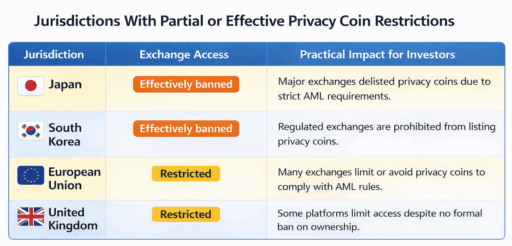 - Japan – Major exchanges delisted privacy coins due to AML concerns