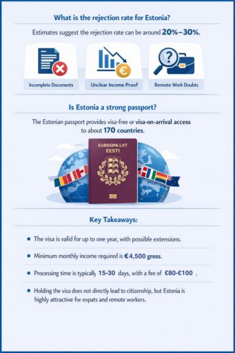 Estimates suggest that the rejection rate for the Estonia digital nomad visa can be around 20%–30%.