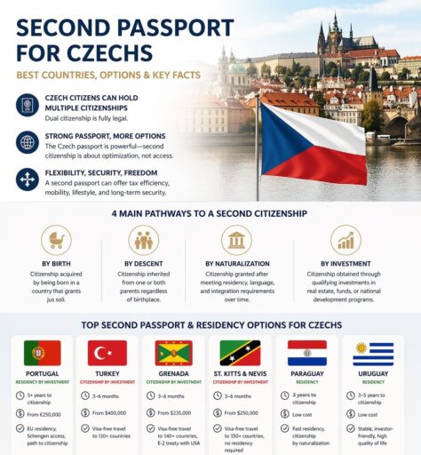 A second passport for Czechs typically involves global programs like Portugal, Turkey, Caribbean citizenship-by-investment options such as Grenada or St. Kitts and Nevis, and South American residency routes like Paraguay or Uruguay, as these best complement an already strong EU passport.