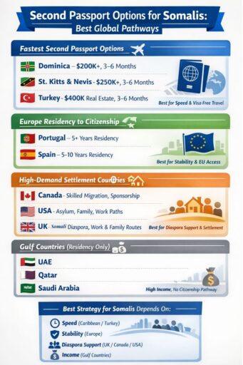 For Somalis, the most practical second passport options are Turkey, Caribbean citizenship-by-investment countries like St. Kitts and Nevis and Dominica, and European residency pathways such as Portugal and Spain, based on budget, timeline, and long-term settlement goals.