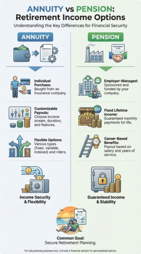 • Annuities are flexible but may have fees; pensions are simpler but less portable.