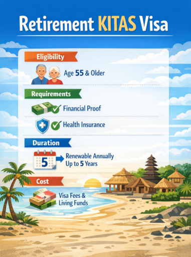 The Retirement Visa, officially for retirees or senior citizens, is issued as a Retirement KITAS, allowing eligible foreigners to reside in Indonesia long-term.